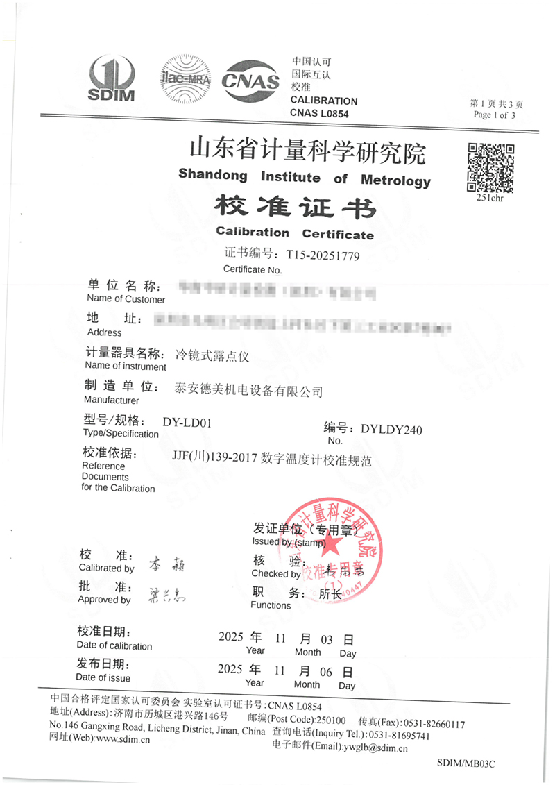 冷鏡式露點儀校準(zhǔn)證書 2025-11-7 本文被閱讀 1059 次