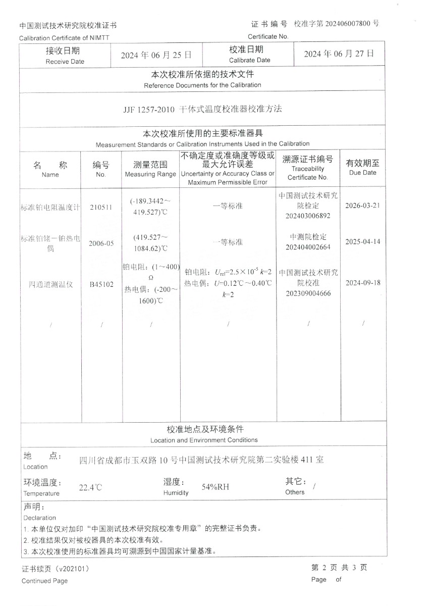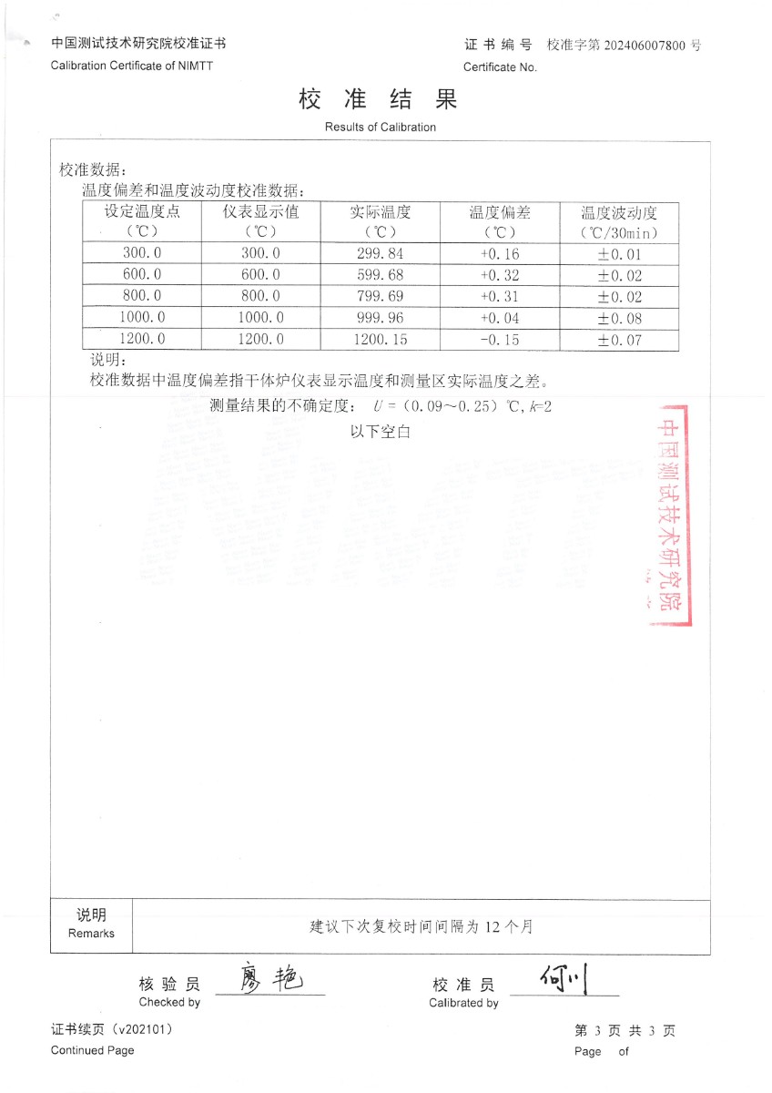 高溫干體爐(300~1200℃)校準(zhǔn)證書 2024-7-1 本文被閱讀 6562 次