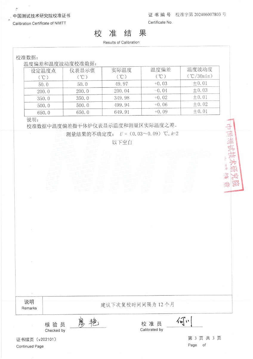 中溫干體爐(50~650℃)校準(zhǔn)證書 2024-7-1 本文被閱讀 6874 次